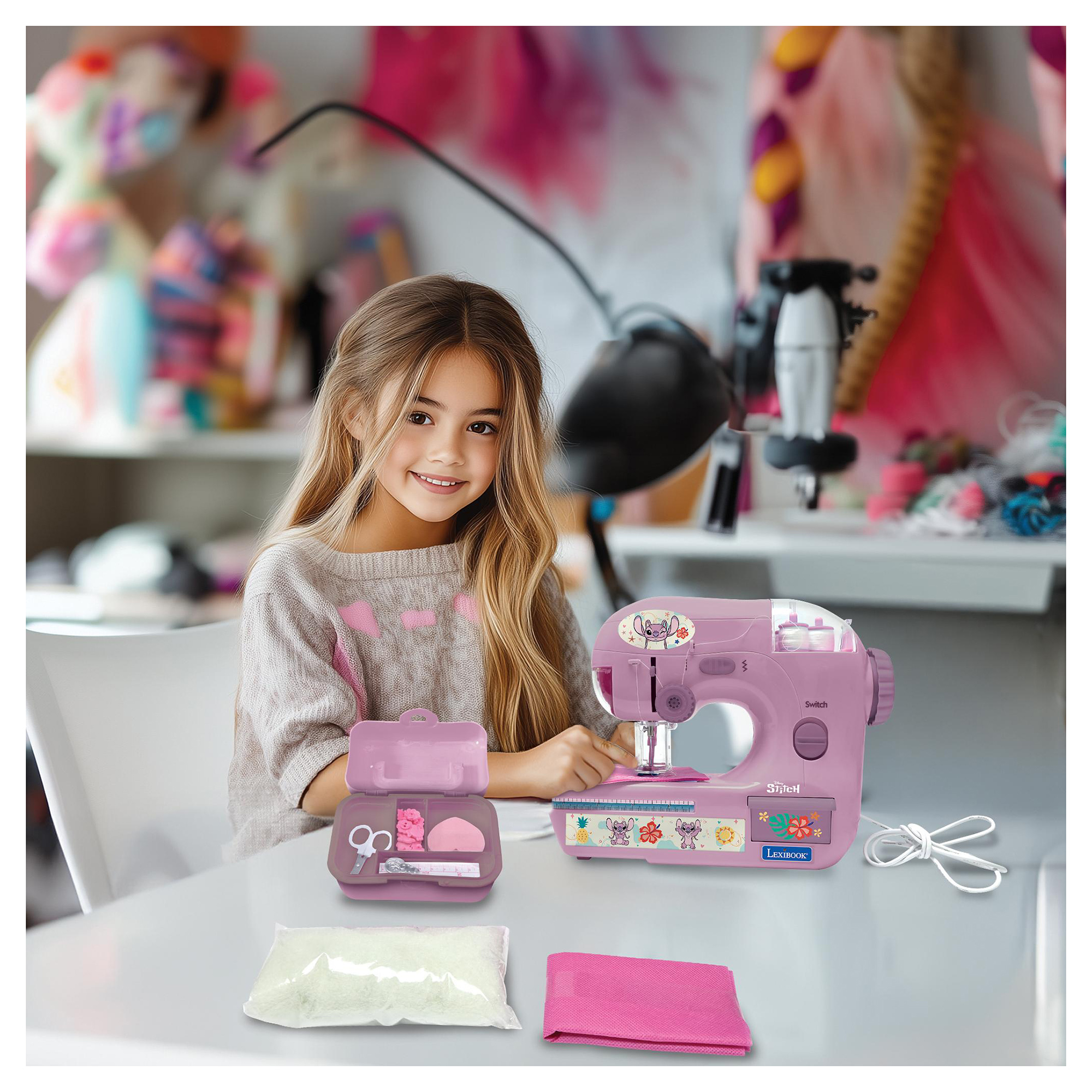 Tento roztomilý šijací stroj so zabudovanou žiarovkou umožňuje deťom vyskúšať si, aké je to šiť oblečenie pre bábiky alebo pre seba. Ovládanie a nastavenie stroja je jednoduché, pričom sa ovláda pomocou pedála, tak ako ten od mamičky. Súčasťou balenia je šijacia sada uložená v škatuľke, ktorá obsahuje nožnice, gombíky, kúsok látky na precvičovanie, cievky nití, svinovací meter, navliekáč ihiel a hubku. Stroj má tiež plastový ochranný kryt, takže je šitie pre deti bezpečné. Stačí navliecť niť, zmerať látku a začať šiť!